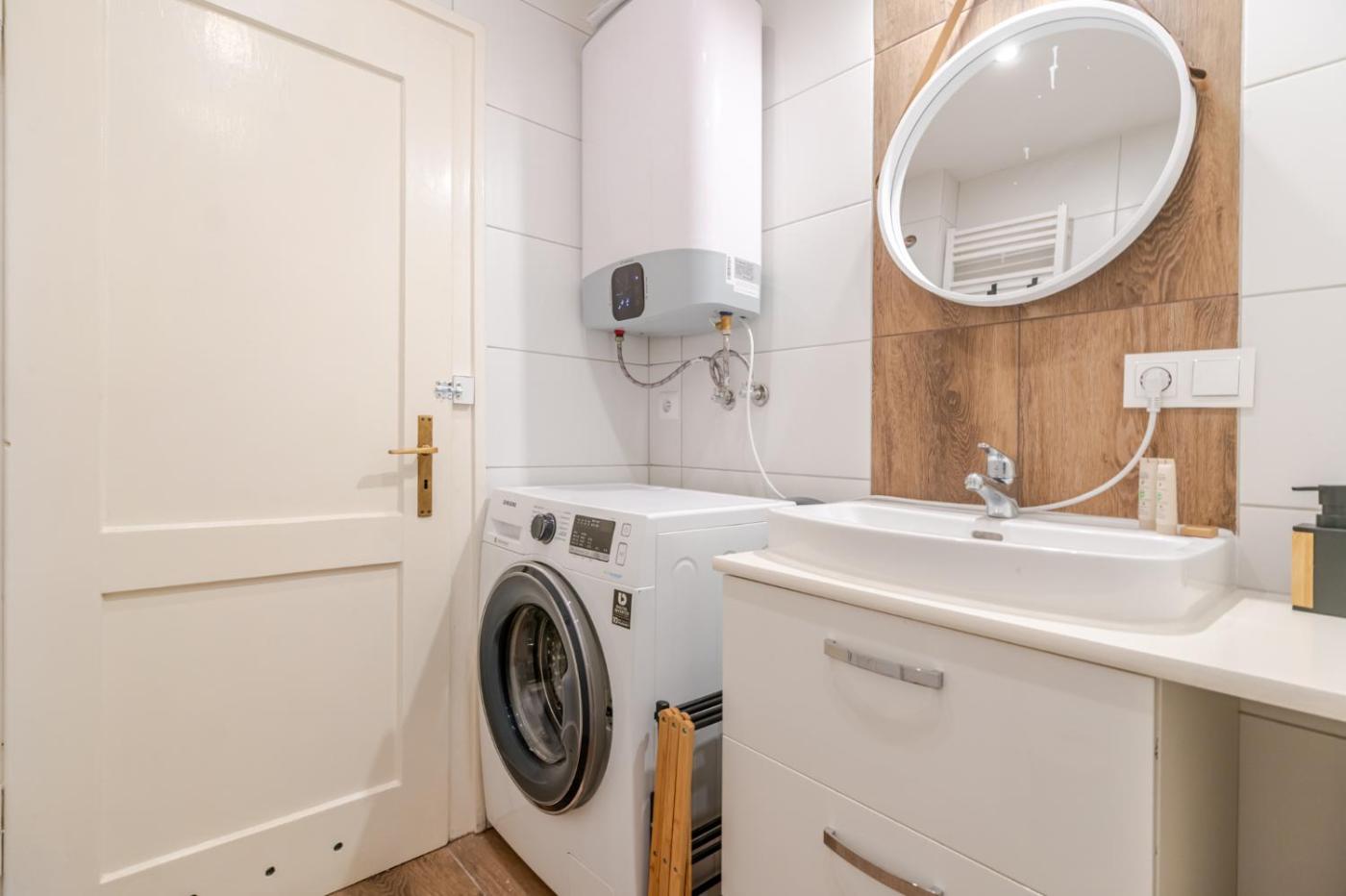 Studio z rozkładaną sofą. The studio offers a washing machine, a private entrance, as well as a private bathroom boasting a shower and a hairdryer. In the well-equipped kitchenette, guests will find a stovetop, a refrigerator, kitchenware and a microwave. The studio is furnished with a desk and a seating area and features a tea and coffee maker and a dining area. The unit has 1 bed. Studio - 2 osobowy. Powierzchnia pokoju ok.: 20 mkw.